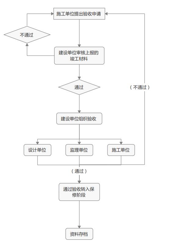 收到符合要求的竣工資料后 7 天內(nèi)組織驗收,驗收由施工單位和建設單位共同進行,由建設單位根據(jù)工程建設內(nèi)容組織,建設單位、設計單位、施工單位、監(jiān)理單位參加。