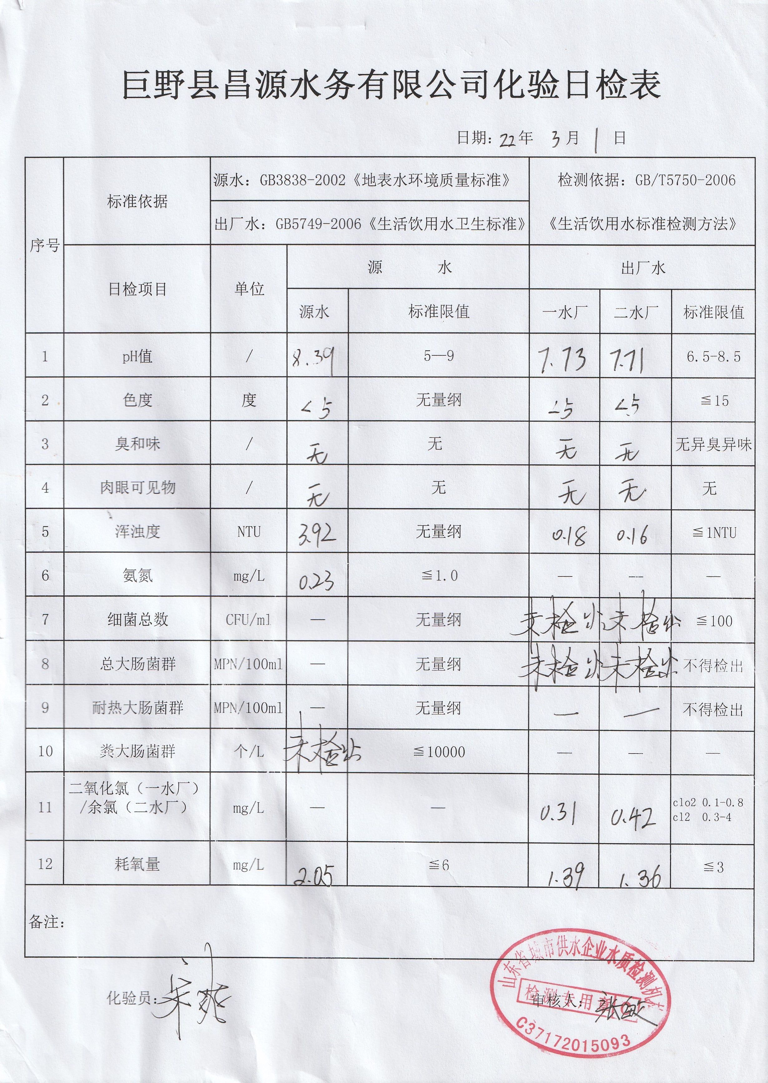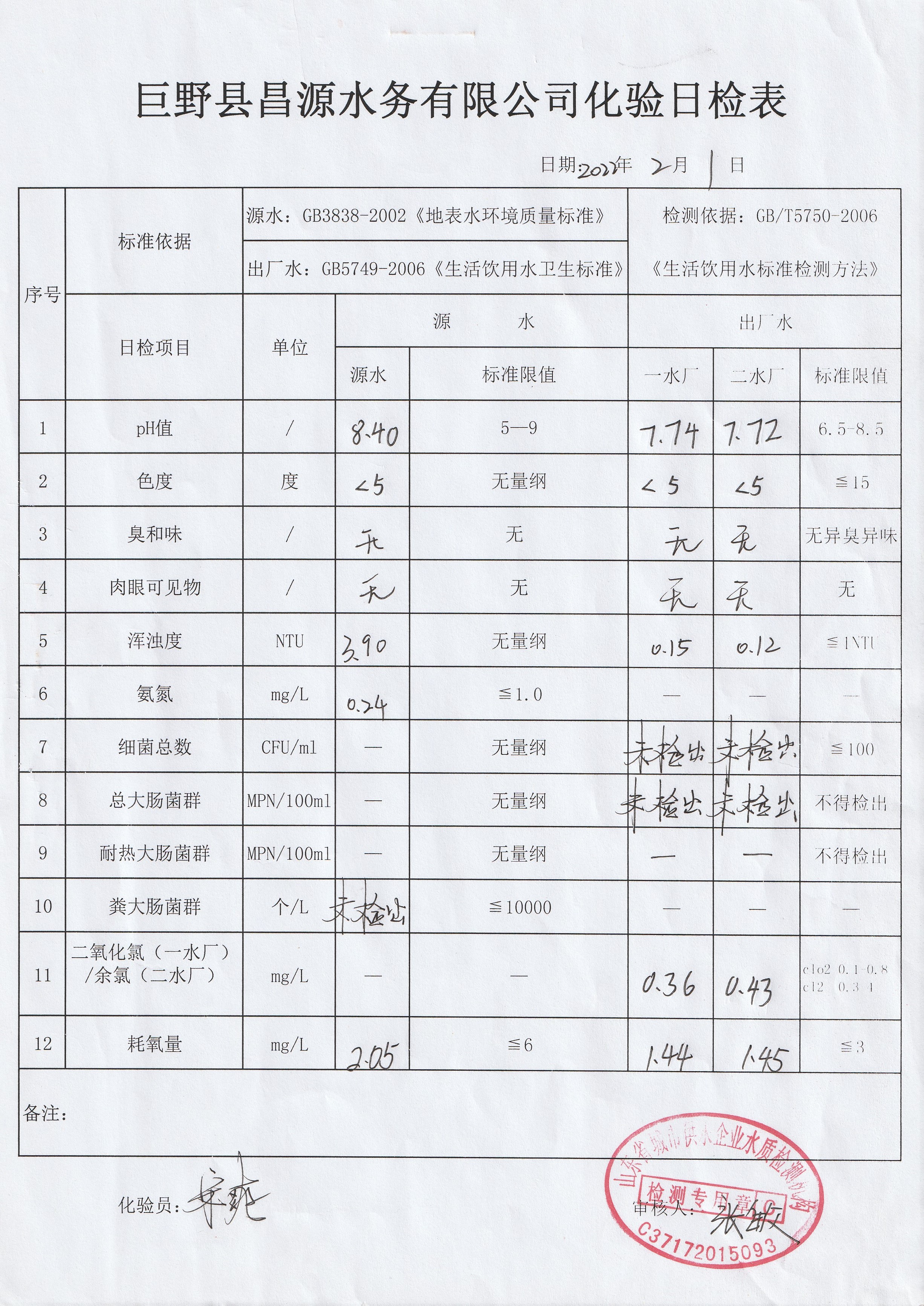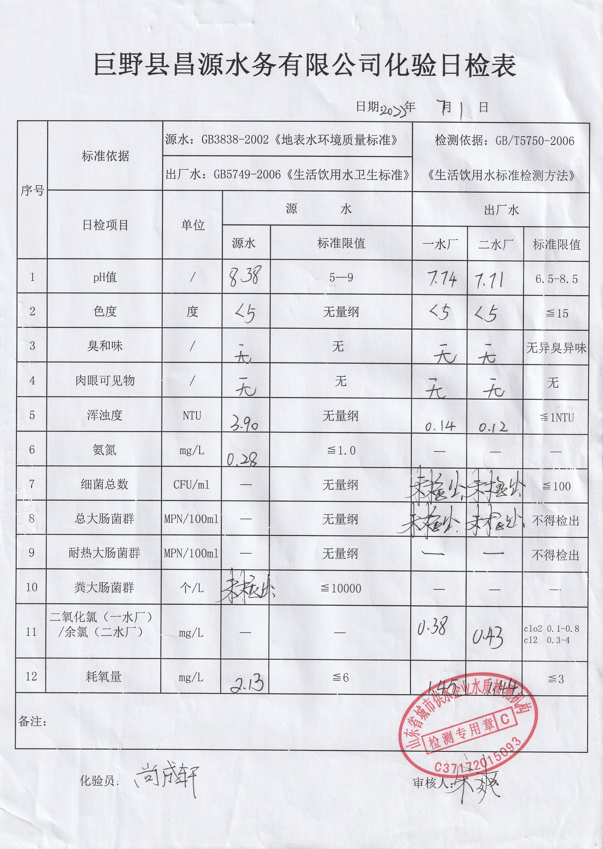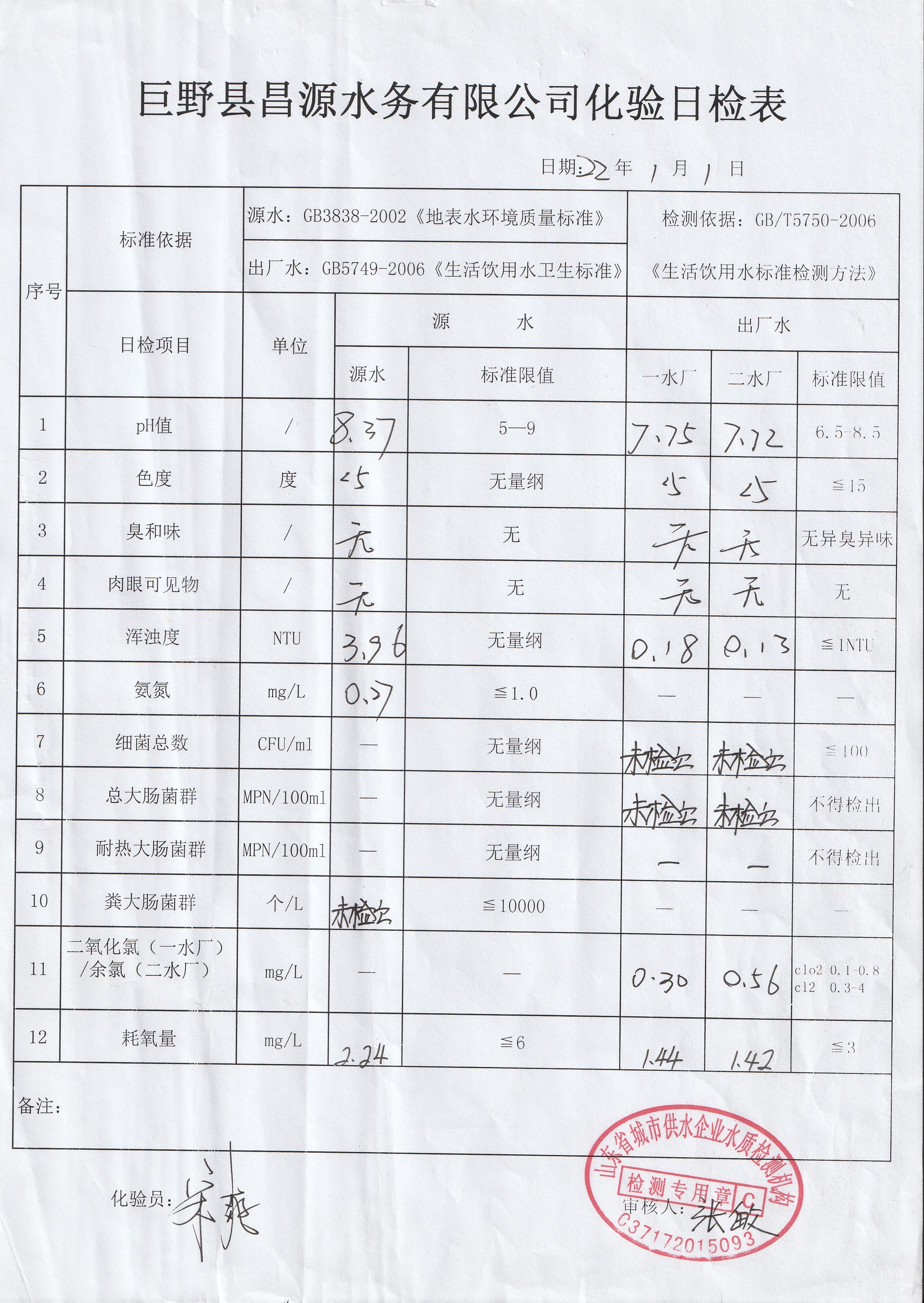 巨野縣昌源水務(wù)有限公司出廠水水質(zhì)信息