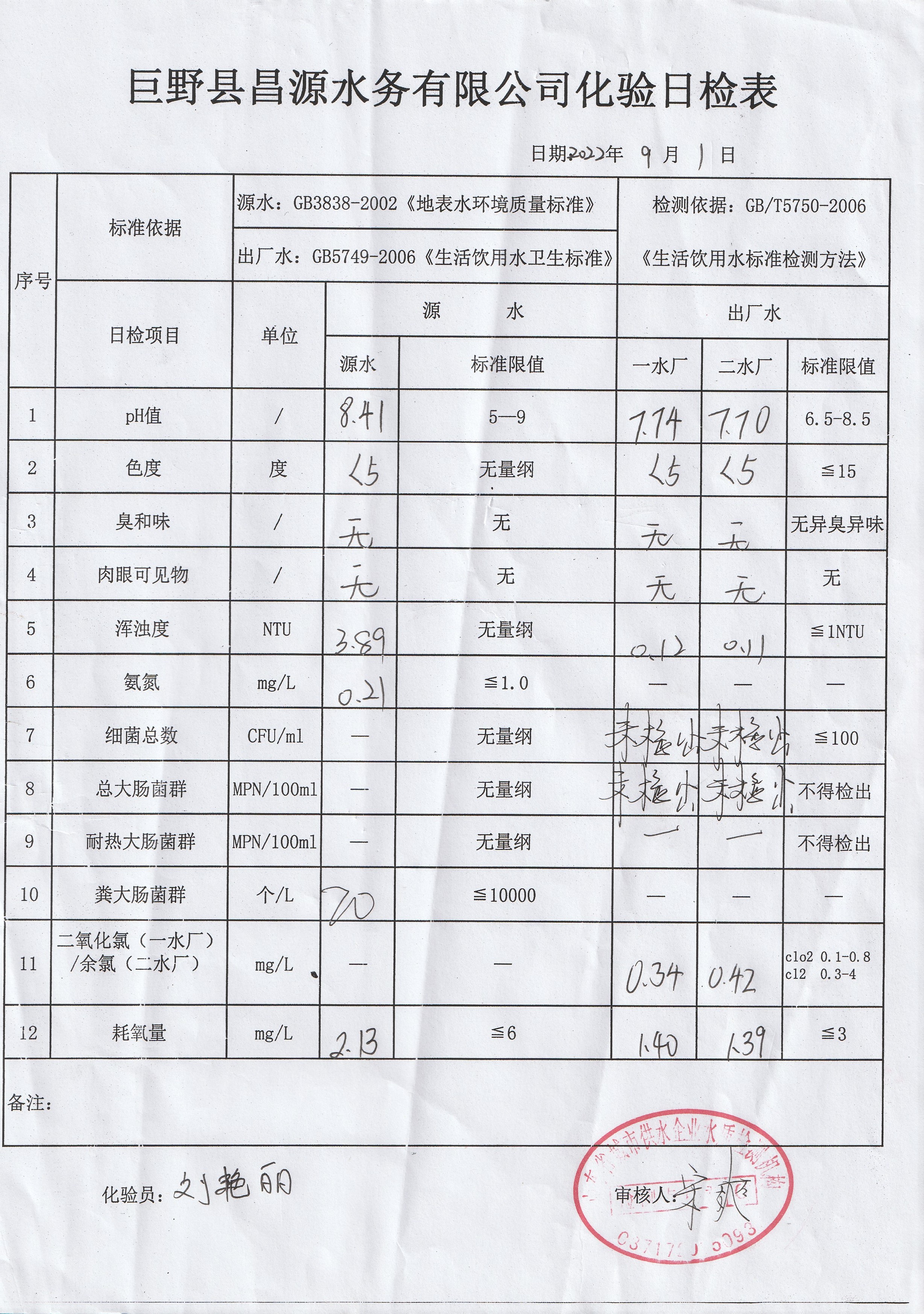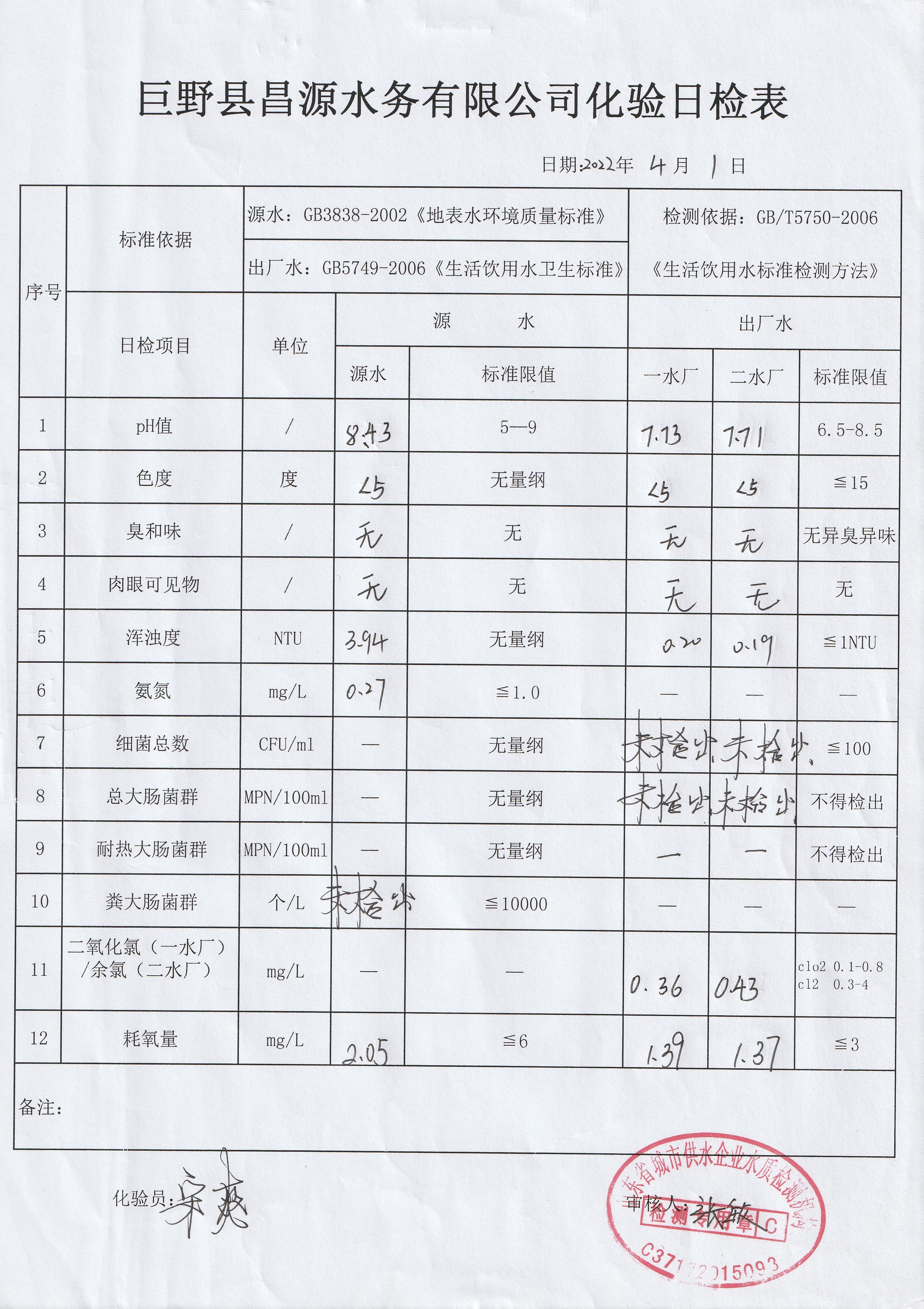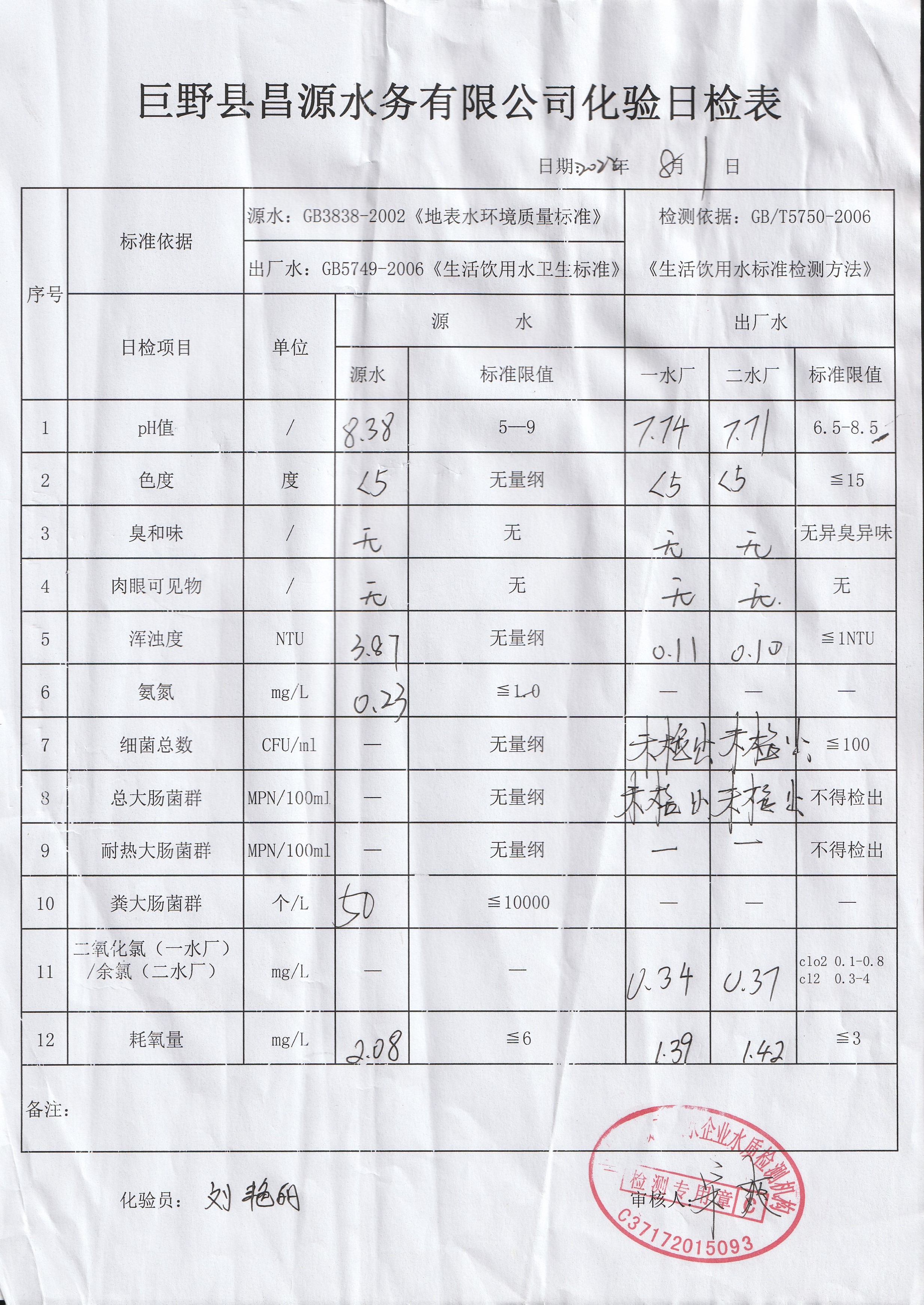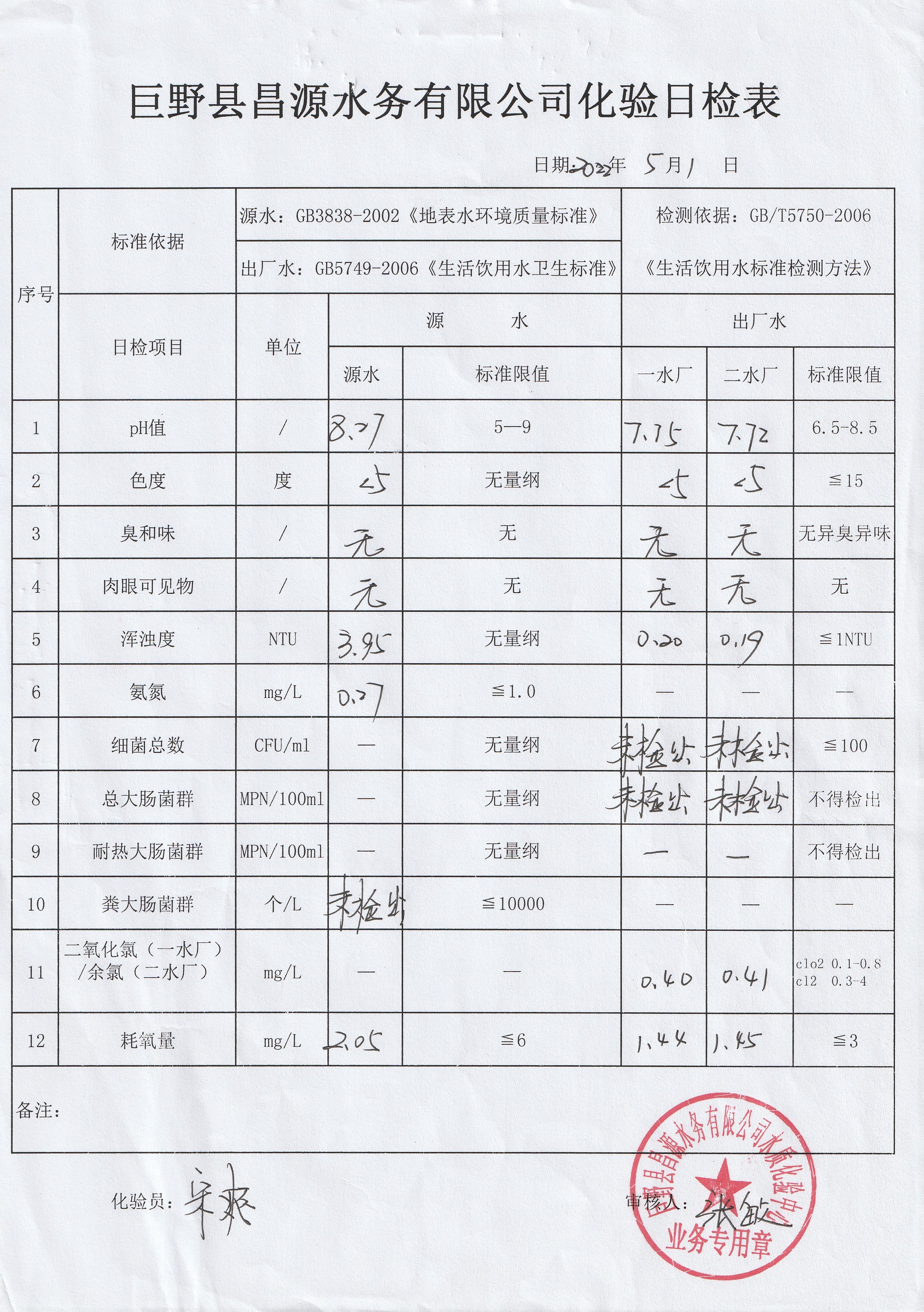 巨野縣昌源水務(wù)有限公司出廠水水質(zhì)信息